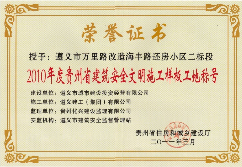遵義海豐還房小區(qū)榮獲“2010年貴州省建筑安全文明施工樣板工地”稱號