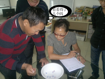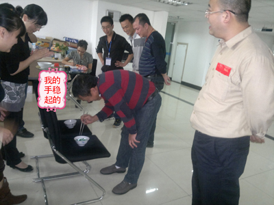 在“筷子夾彈珠”的游戲中,許總在規(guī)定的1分鐘時(shí)間內(nèi)夾起了17顆玻璃彈珠,以絕對(duì)優(yōu)勢(shì)奪得第一。